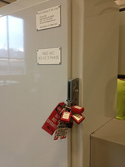 Buyer understands that holes must never be cut in machine or fiber duct near a nip point due to the safety hazard to employees and customer assumes full liability for such holes if cut. Buyer is responsible for the safe operation and maintenance of the equipment. Before performing any cleaning or maintenance, the disconnect should be in the OFF position and LOCKED OUT with an approved lock and LOCK OUT/TAG OUT system. Removal of guards or safety devices voids manufacturer's warranty and may result in personal injury. Therefore, once cleaning or maintenance is completed, be sure to replace all guards and safety devices. To avoid a safety hazard, NEVER operate the equipment without guards and transitions are in place and doors locked.